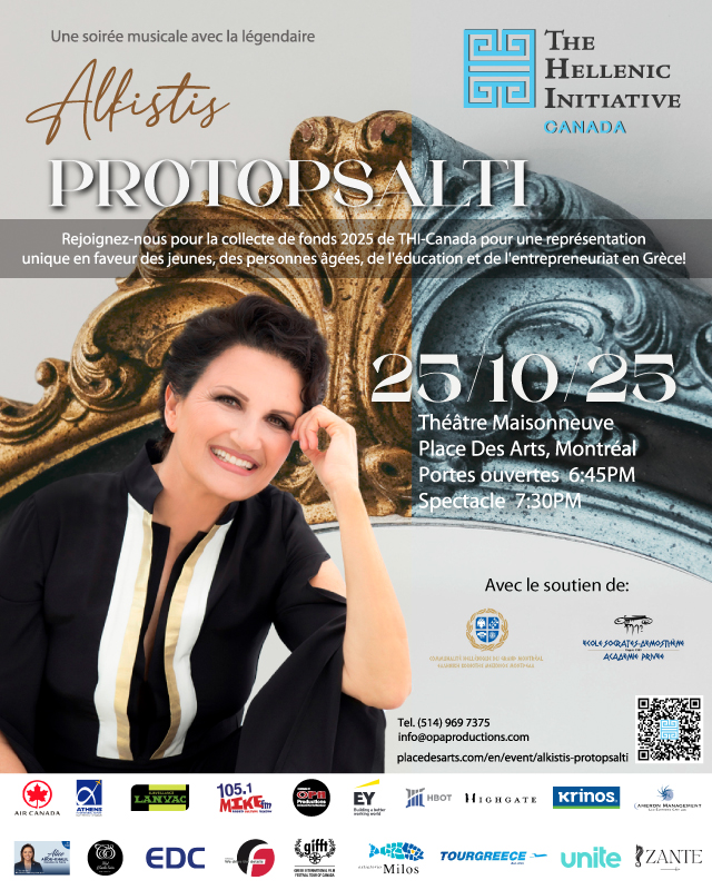 Το Σάββατο 25 Οκτωβρίου 2025, η θρυλική φωνή της ελληνικής σκηνής Άλκηστις Πρωτοψάλτη θα αντηχήσει στη σκηνή του Théâtre Maisonneuve, του συγκροτήματος Place des Arts στο Μόντρεαλ, σε μια συναυλία αφιερωμένη στην προσφορά και στην ενίσχυση σημαντικών κοινωνικών σκοπών. Η εκδήλωση οργανώνεται υπό την αιγίδα του The Hellenic Initiative Canada (THI Canada), με επικεφαλής την εθελοντική επιτροπή στην οποία προεδρεύει ο Robert Peck, επίτιμος διευθυντής του THI Canada και πρώην πρέσβης του Καναδά στην Ελλάδα. Μέρος των εσόδων της φιλανθρωπικής αυτής συναυλίας θα διατεθεί για την υποστήριξη προγραμμάτων στην Ελλάδα, ιδίως σε τομείς όπως η νεολαία, η εκπαίδευση, η περιβαλλοντική δράση και η αντιμετώπιση κρίσεων.