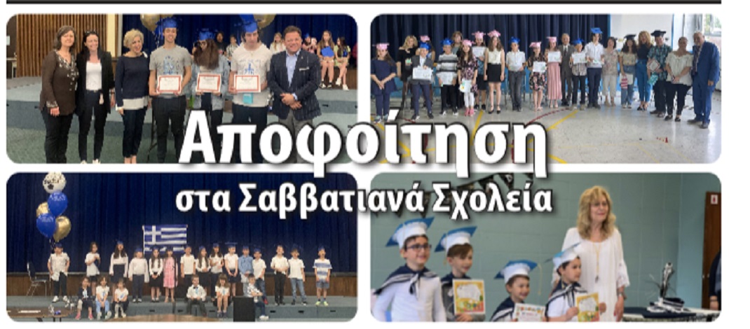 Με λαμπρότητα πραγματοποιήθηκαν οι τελετές αποφοίτησης των Δημοτικών σχολείων “Πλάτων Όμηρος”, “‘Άγιος Νικόλαος” και Γ/Λ “Αριστοτέλης”, της Συμπληρωματικής Εκπαίδευσης της ΕΚΜΜ. Οι απόφοιτοι του νηπιαγωγείου των Δημοτικών και του Λυκείου “Αριστοτέλης”, πλαισίωσαν την τελετή με τραγούδια, ποιήματα, παραδοσιακούς χορούς αλλά και βαθιές, συγκινητικές εξομολογήσεις για τα αξέχαστα χρόνια που έζησαν στα Σαββατιανά σχολεία. Τις εκδηλώσεις τίμησαν με την παρουσία τους η Υφυπουργός Τουρισμού Καναδά και Οικονομικής Ανάπτυξης για την επαρχία του Québec Άννυ Κουτράκη, η Πρόεδρος του Περιφερειακού Συμβουλίου της Νότιας Ακτής Αφροδίτη Σταθοπούλου, η Γραμματέας Νεολαίας της ΕΚΜΜ Αντωνία…